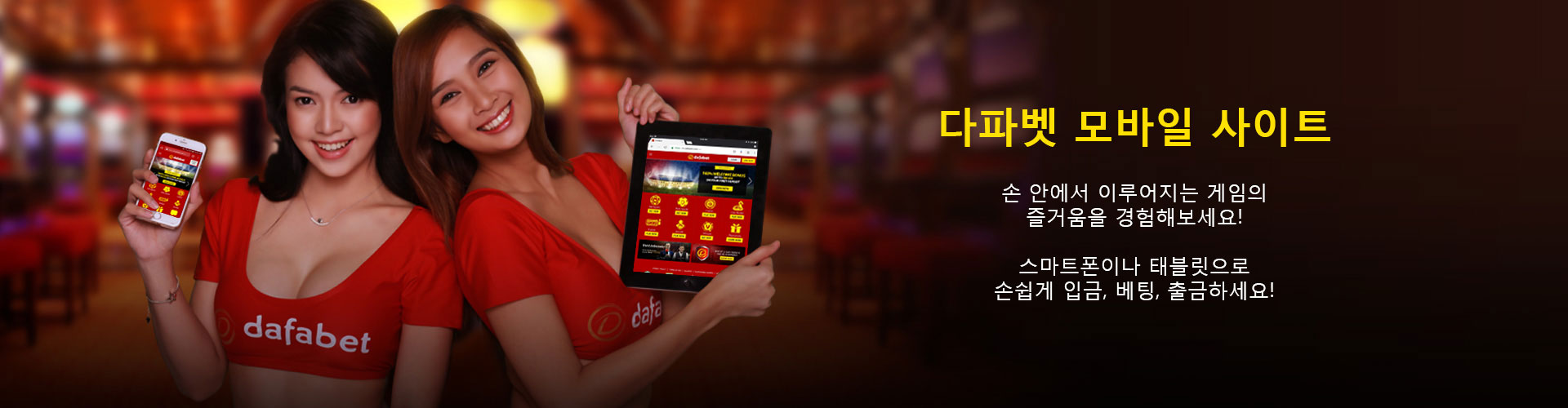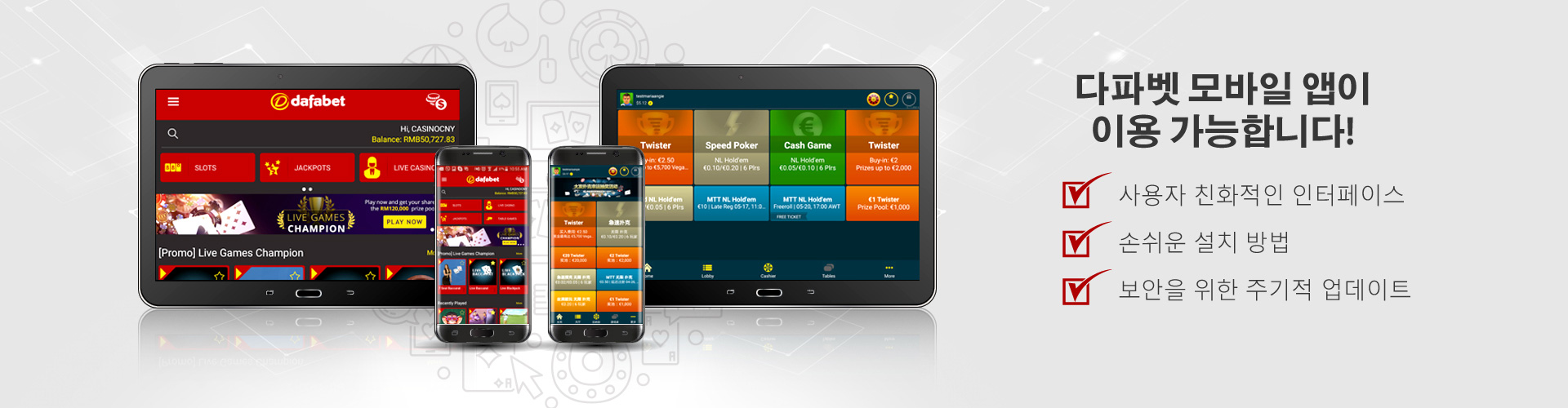 불법적인 베팅을 방지하기 위해, 다파벳(Dafabet)은 제공된 정보의 진위 여부를 확인하기 위한 검사를 실시할 권리를 보유합니다. 귀하가 만 18세 이상인지 확인하기 위해 제3자를 통한 조회가 이루어질 수 있습니다.